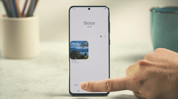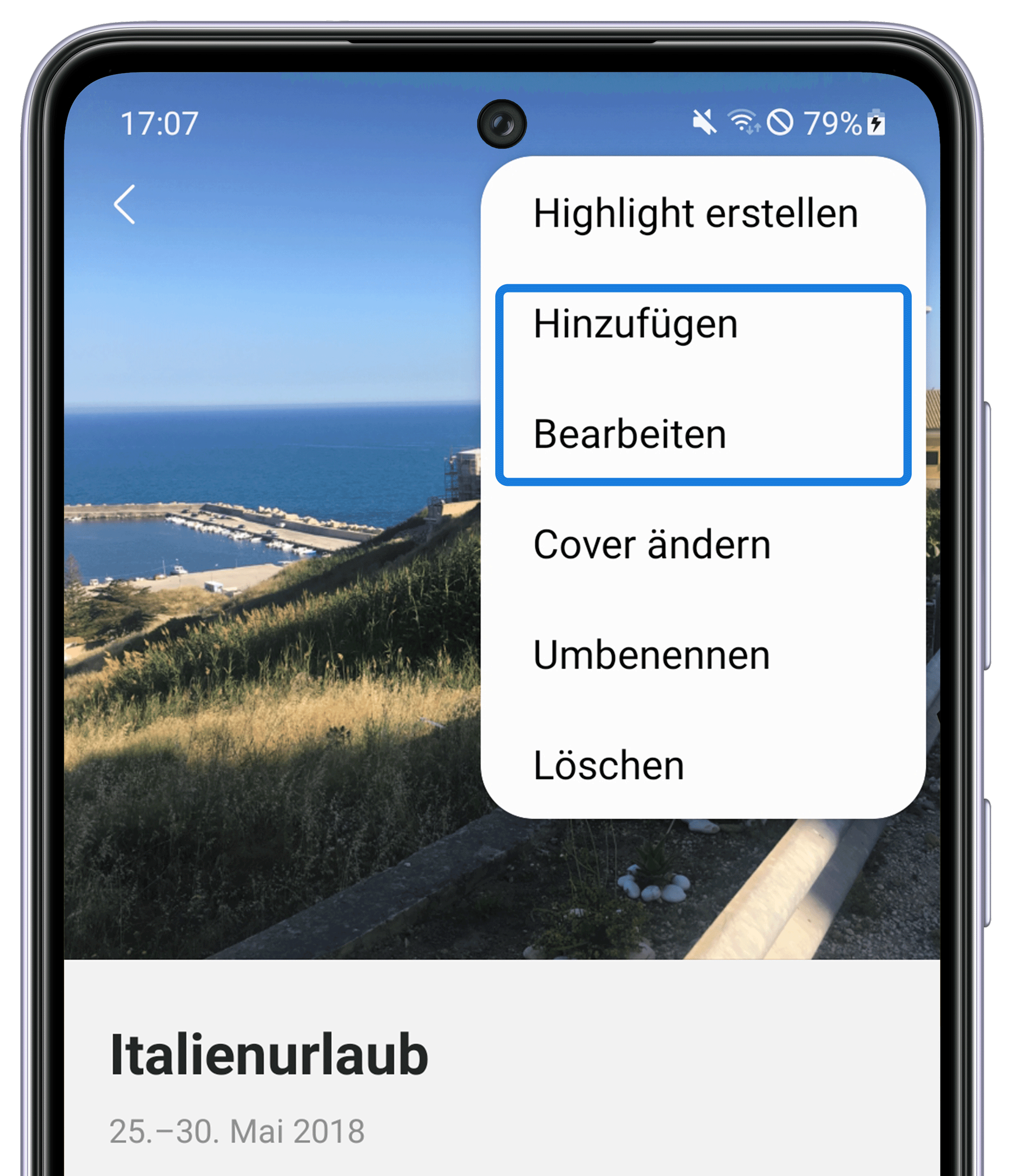 Starte die Galerie App, tippe unten in der Leiste auf Storys und wähle eine automatisch erstellte Story aus. Möchtest du weitere Bilder oder Videos hinzufügen oder löschen, tippe oben rechts auf das Drei Punkte -Symbol und anschließend auf Hinzufügen oder Bearbeiten .
