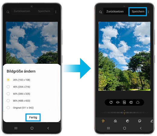 Machst du Fotos mit der höchsten Auflösung der Kameras, sind die gespeicherten Dateien oft groß. Möchtest du die Bilder auf eine Webseite hochladen oder verschicken, kannst die Dateigröße einfach mit den Bearbeitungsfunktionen der Galerie App ändern.