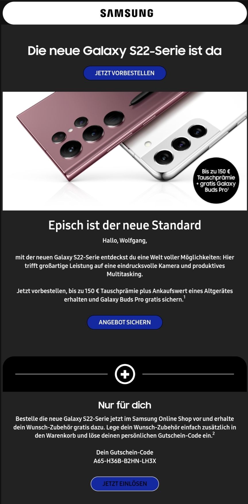Dazu habe ich von Samsung eine andere Mail erhalten, in der ein Vorbesteller-Gutschein-Code enthalten ist aber nicht dabei steht, wie hoch der dann ist.