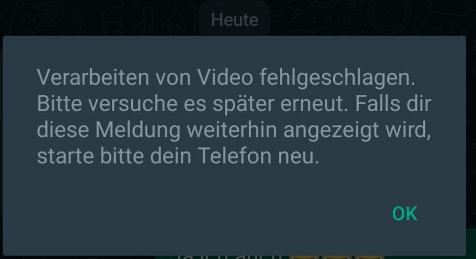 ich kann keine Videos verschicken bei WhatsApp oder kein Video in den Status setzen. Es kommt immer die Fehlermeldung auf dem Bild. Ich kann das Telefon so oft ich will neu starten aber es verschickt nichts.